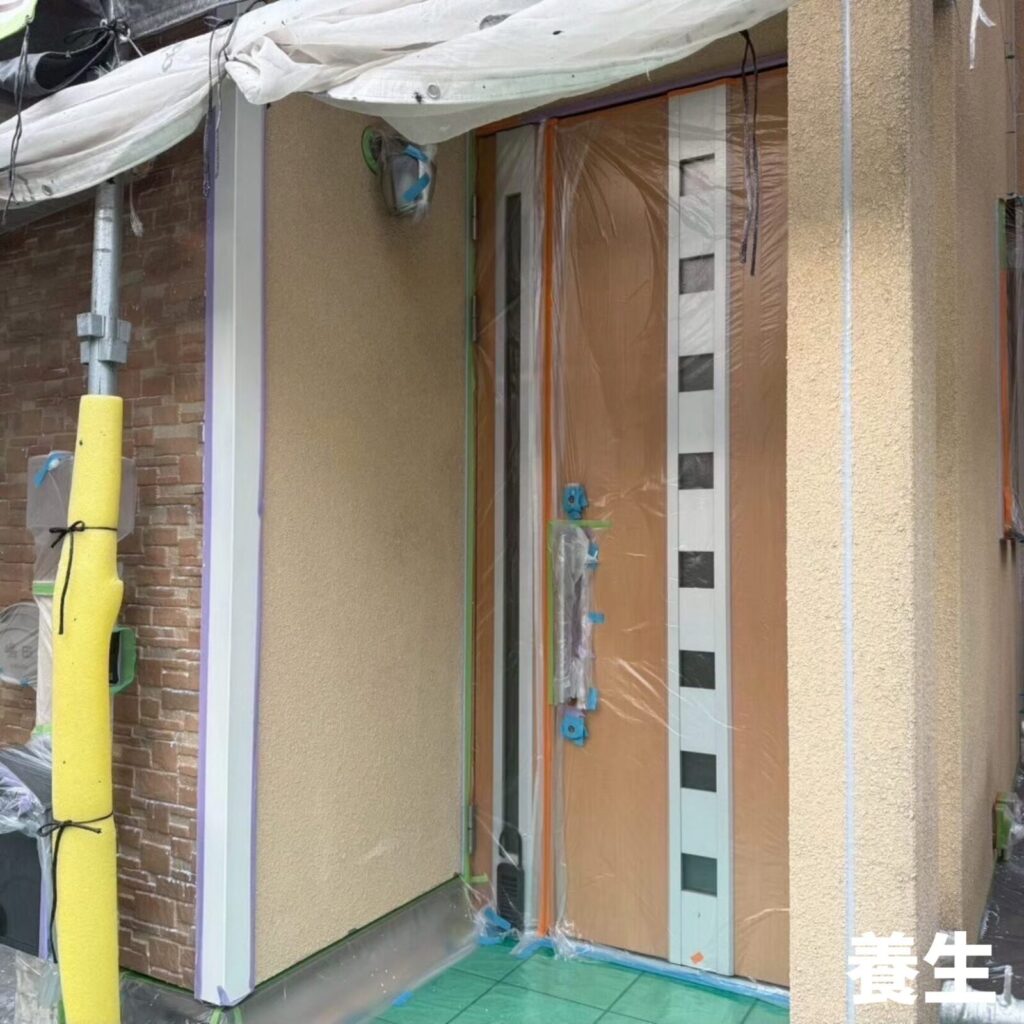 ➡外壁塗装を行う際に「塗装する箇所以外に塗料が付着しないようにビニール等でカバーすること」です。📝
