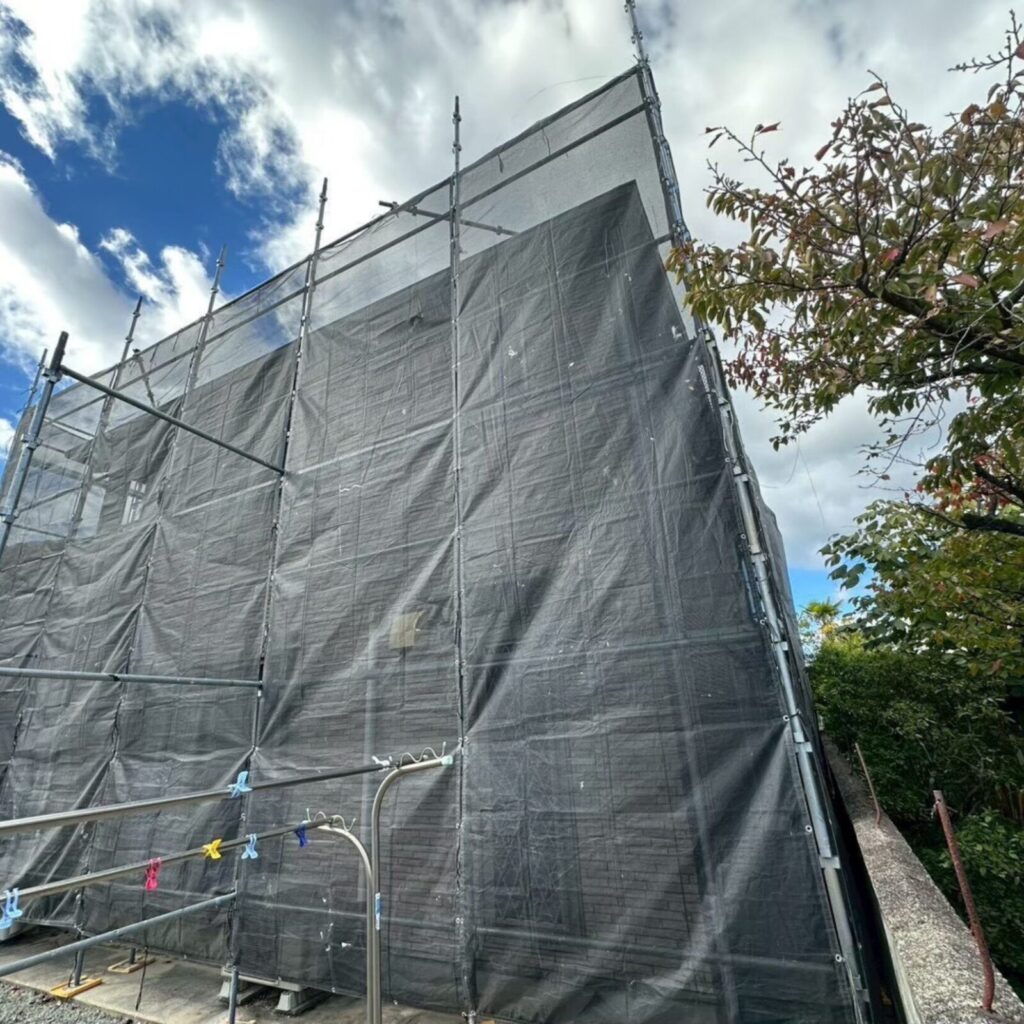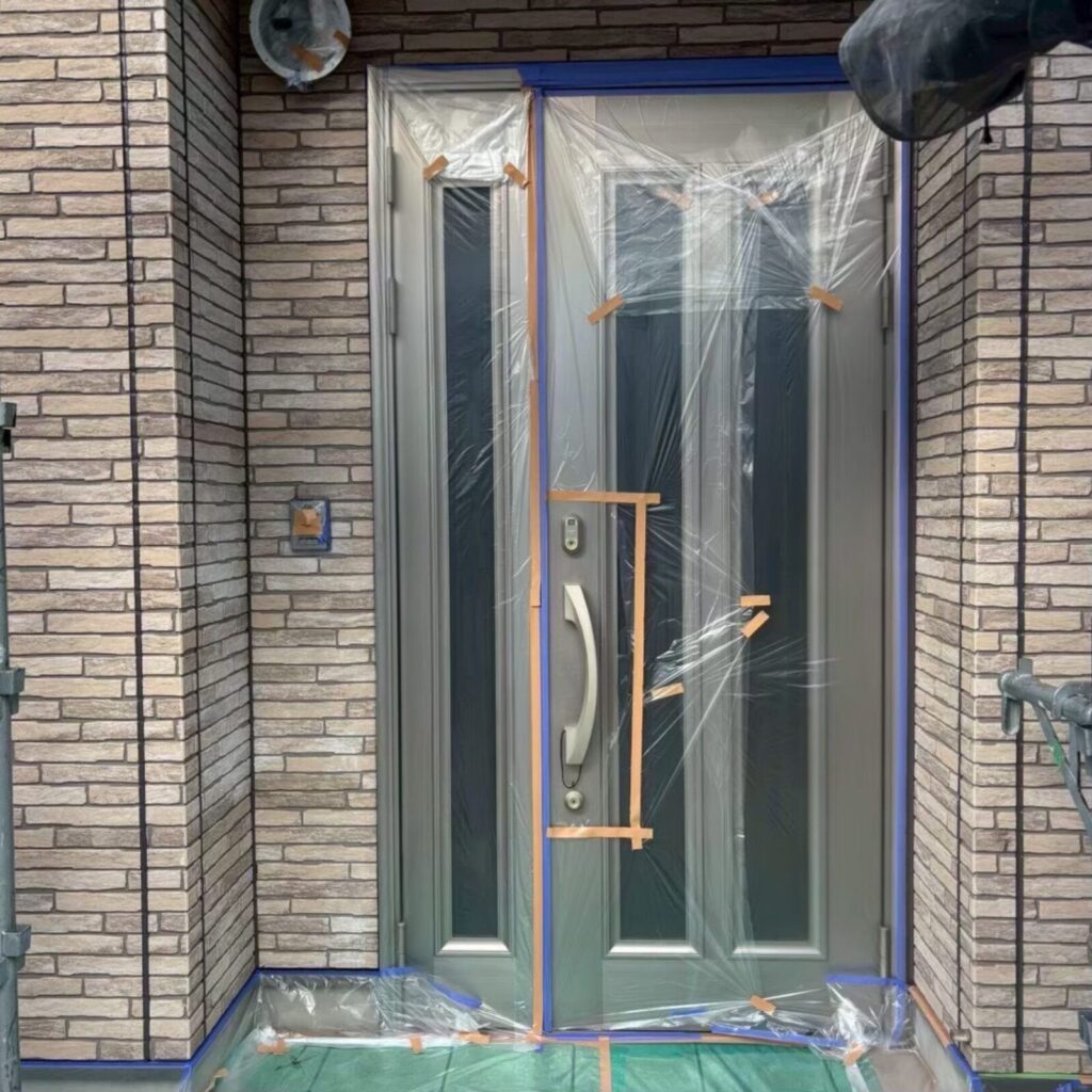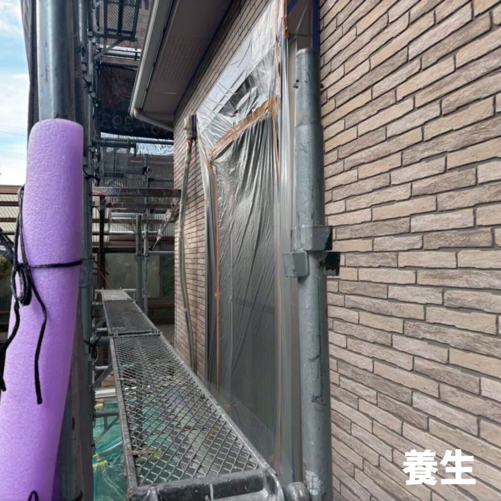 ➡外壁塗装を行う際に「塗装する箇所以外に塗料が付着しないようにビニール等でカバーすること」です。📝