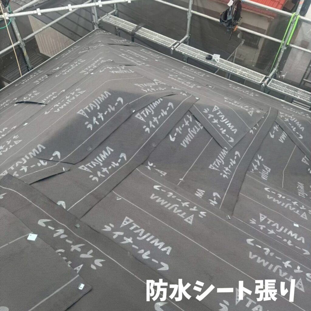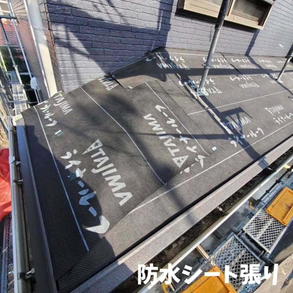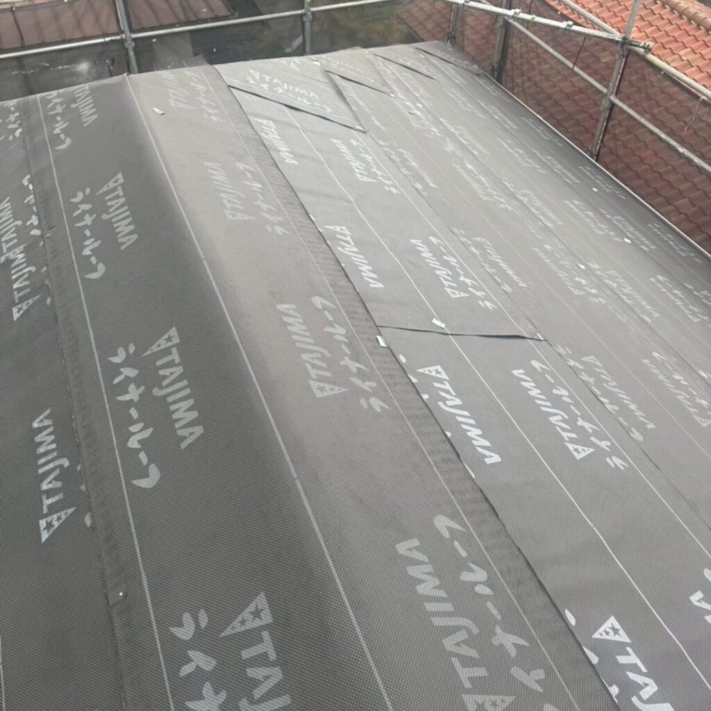 既存の屋根の上にルーフィング(防水紙)を貼り、その上に軽い金属の屋根を張ります。