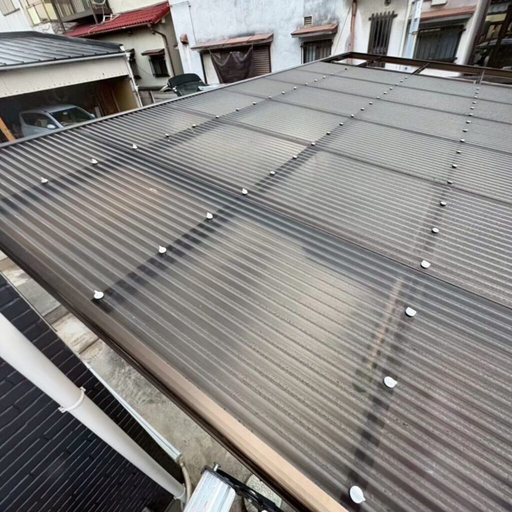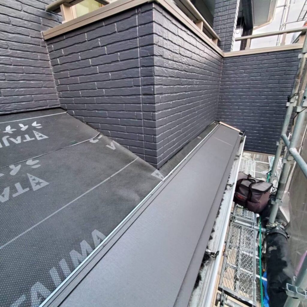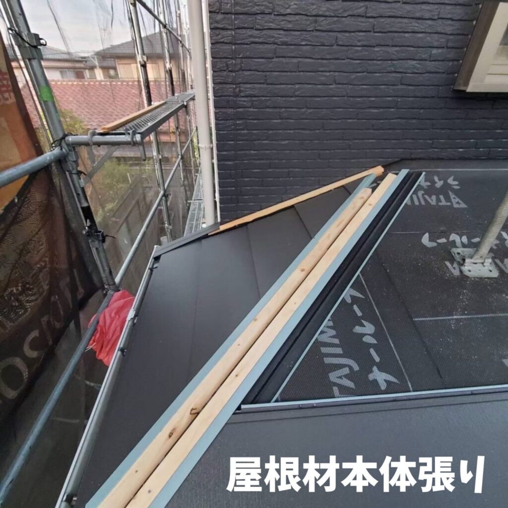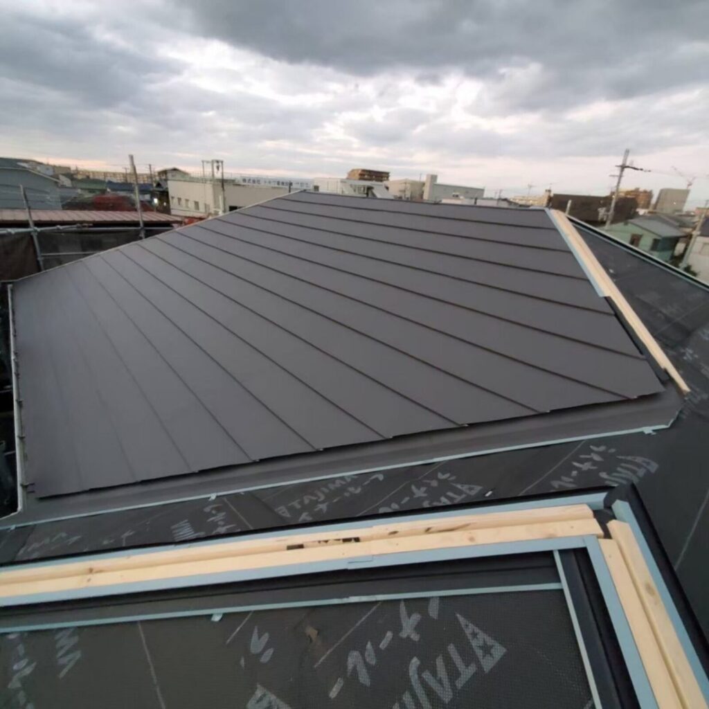 既存の屋根の上にルーフィング(防水紙)を貼り、その上に軽い金属の屋根を張ります。